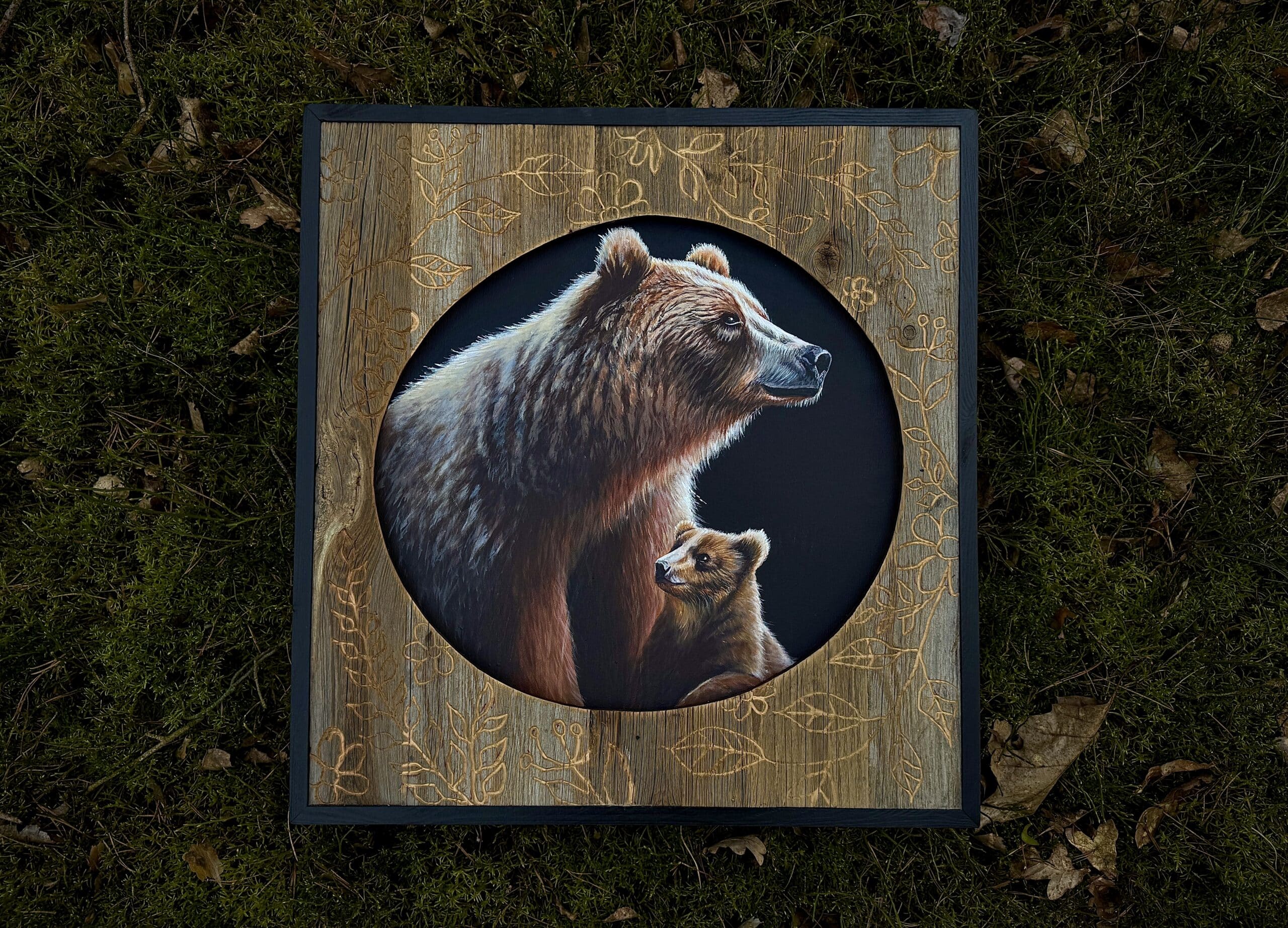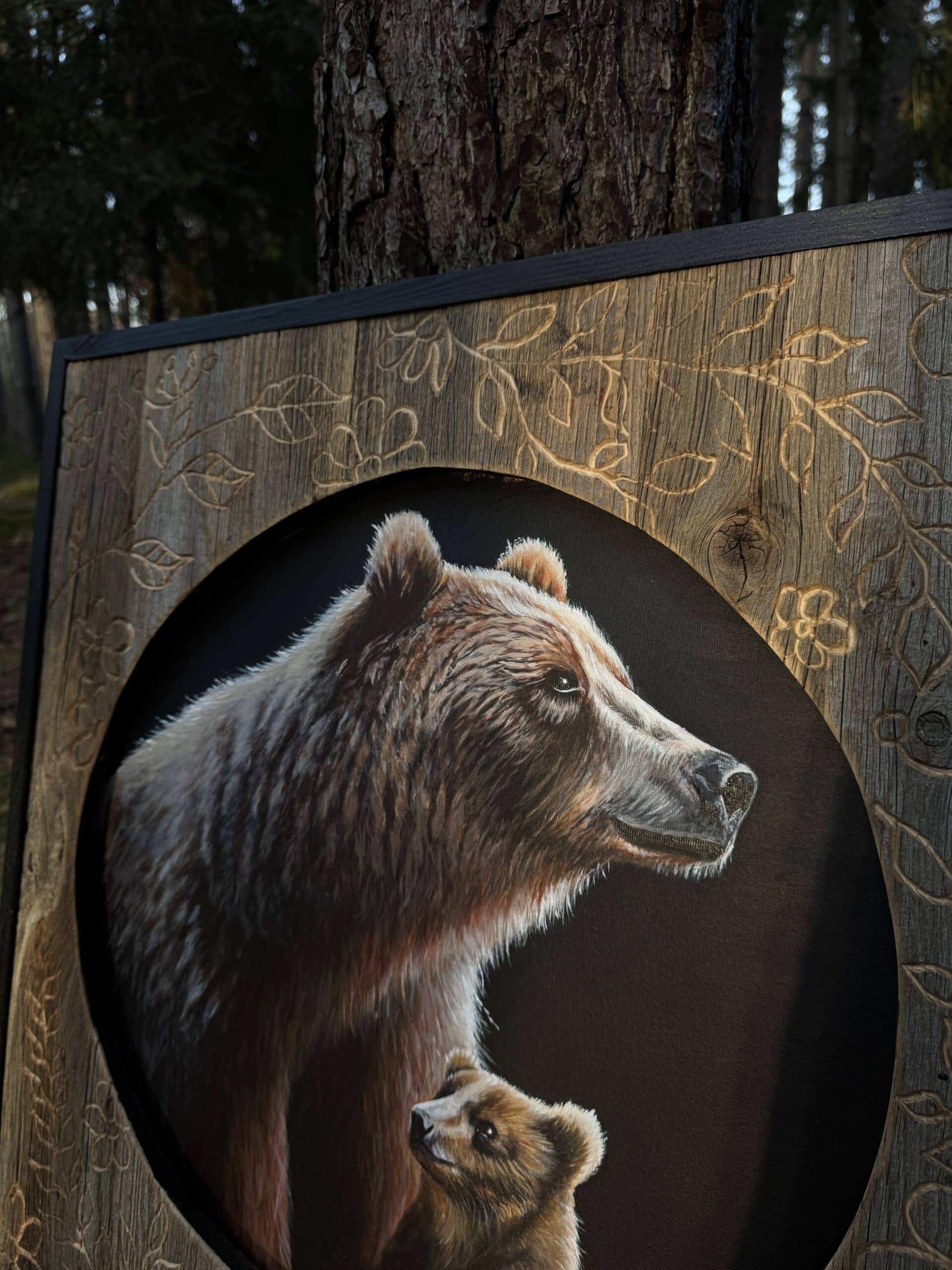 Nie bez powodu z wykształcenia jestem Zielarką. Roślinne frezowania to symbol mojej miłości do natury, która teraz w przedwiośniu budzi się do życia, a ja razem z nią. ,,Misie” to obraz bardzo prosty w przesłaniu, jak wzór który odręcznie wycięłam w drewnie. Rdzeń obrazu to ja i moja córka- rodzina którą tworzymy. Niedźwiedzica to matka- silna, piękna, odważna, spokojna i mądra.